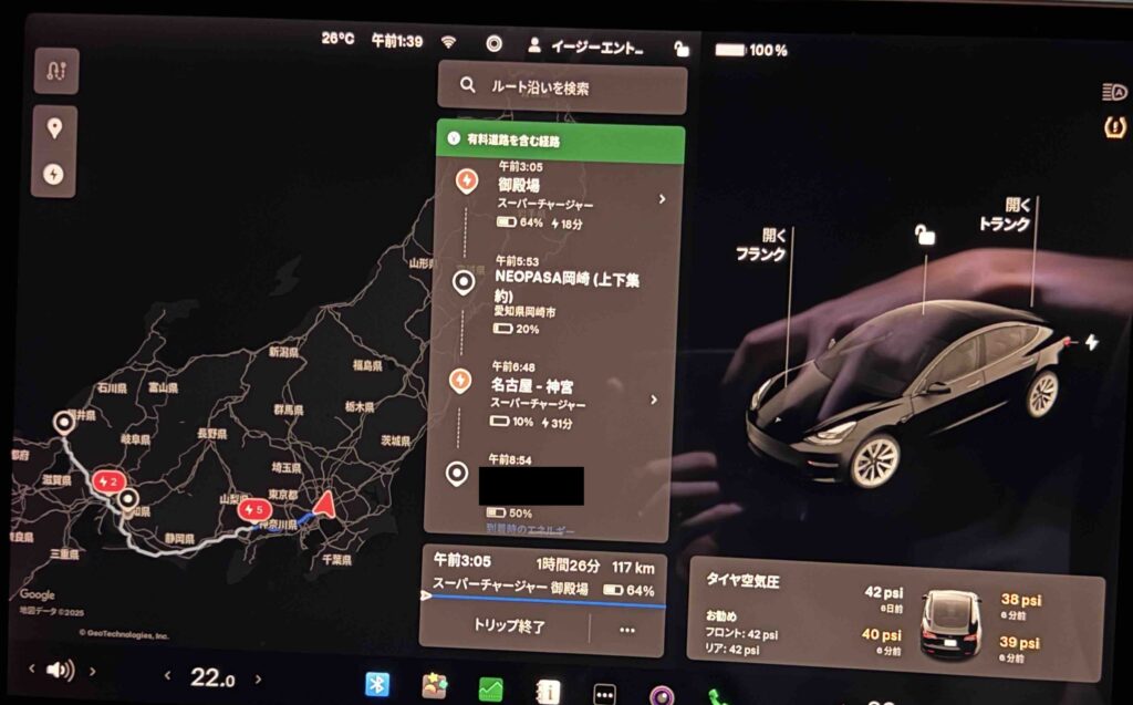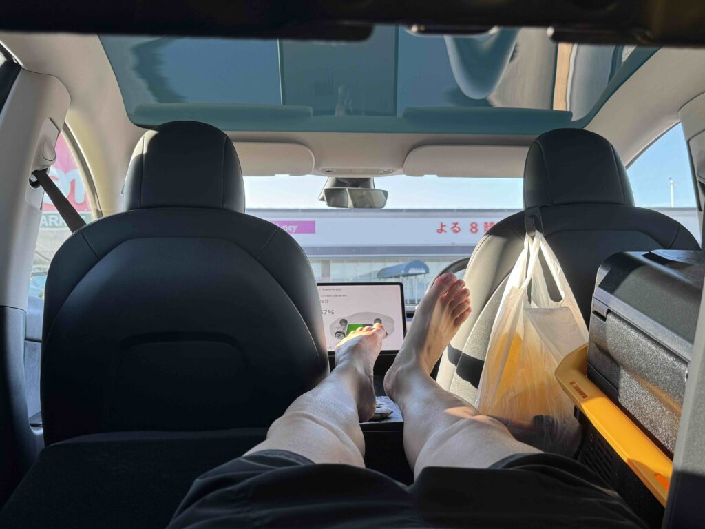 出発は土曜日の深夜です。20:00ごろからバッテリーを80%⇨100%に向けてチャージし始め、100%の状態で出発することができました。